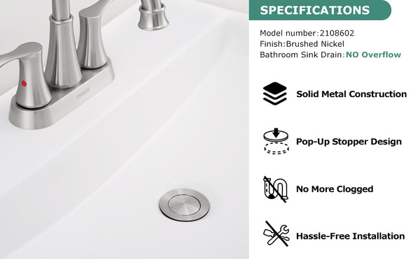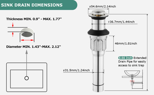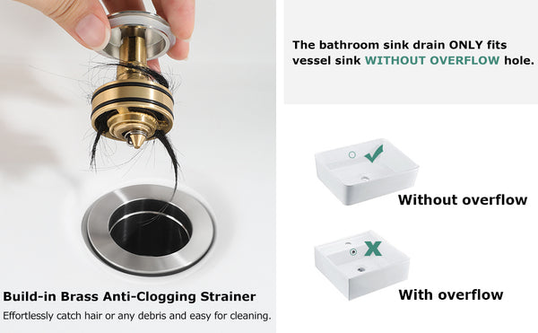 - NOTE: This sink drain only fits bathroom sink WITHOUT OVERFLOW HOLE. Please confirm the drain size before purchasing.