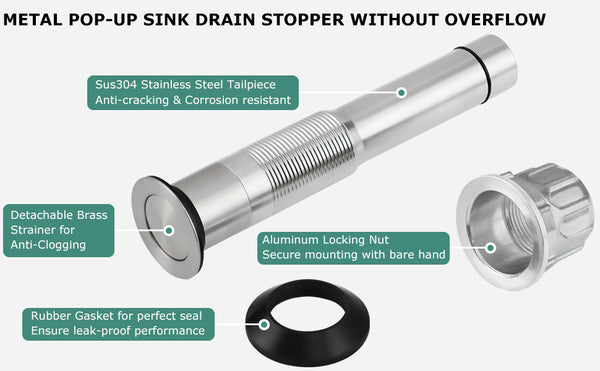 - SOLID METAL CONSTRUCTION - The bathroom sink drain is constructed of brass strainer and thickened 304 stainless steel tailpiece. Not only for maximum durability, but also for corrosion & rust-resistant.