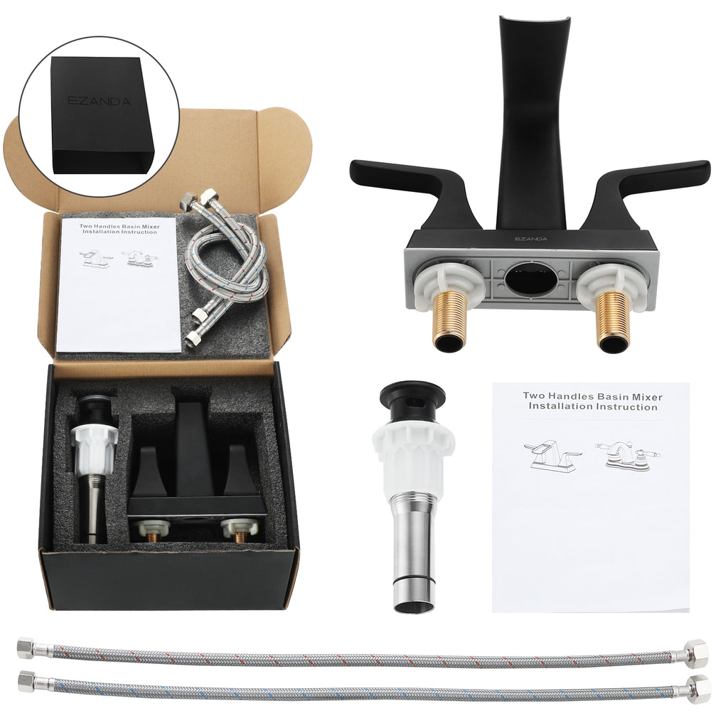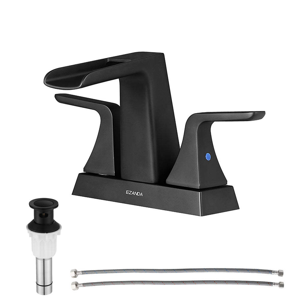 EZANDA 2-Handle Waterfall Faucet, 4 Inch Centerset Bathroom Sink Faucet with Metal Pop-up Sink Drain & Faucet Supply Lines, Matte Black (1433004)