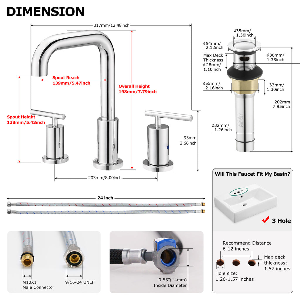 - 3 Holes deck mount compatible with widespread installations at any distance between 6 and 12 inches. Hole size: 32-35mm/ 1.25-1.37 inch.
