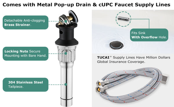 - The bathroom sink faucet set include solid metal Pop-up drain assembly and cUPC certified water supply lines.(NOTE: The Pop-up drain only fits bathroom sink with overflow hole)