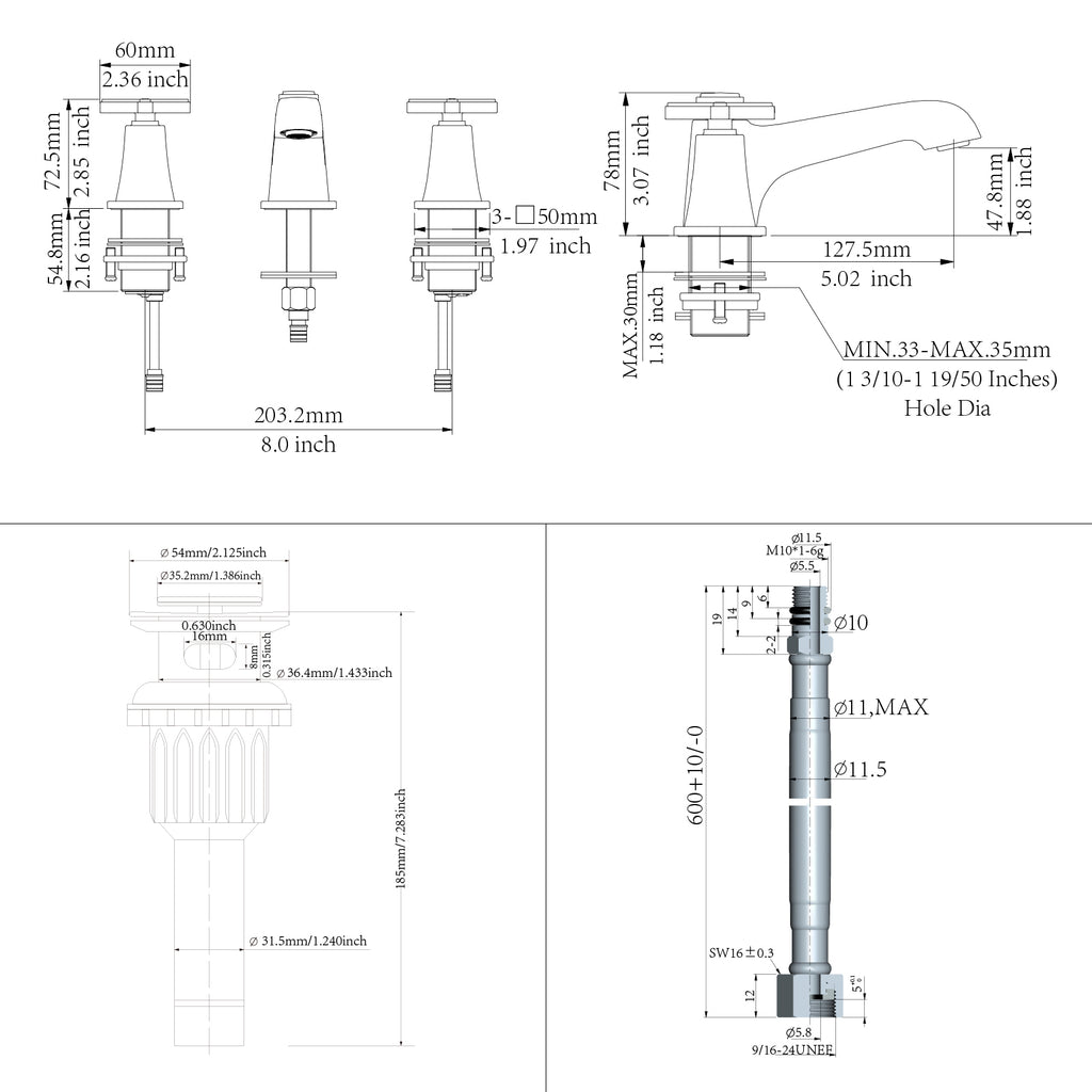 - Comes with Hot & Cold Faucet Supply Lines for stop valves connecting. (Length: 23.6 inch /600 mm, Thread: 9/16-24 UNEF standard)