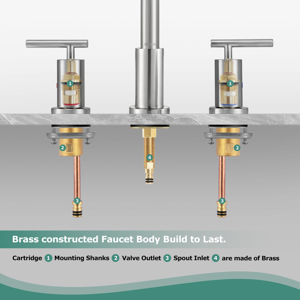 - Brass Constructed Faucet Main Body Build to Last. The Faucet Cartridge, Mounting Shanks, Valve Outlet and Spout Inlet are made of Brass