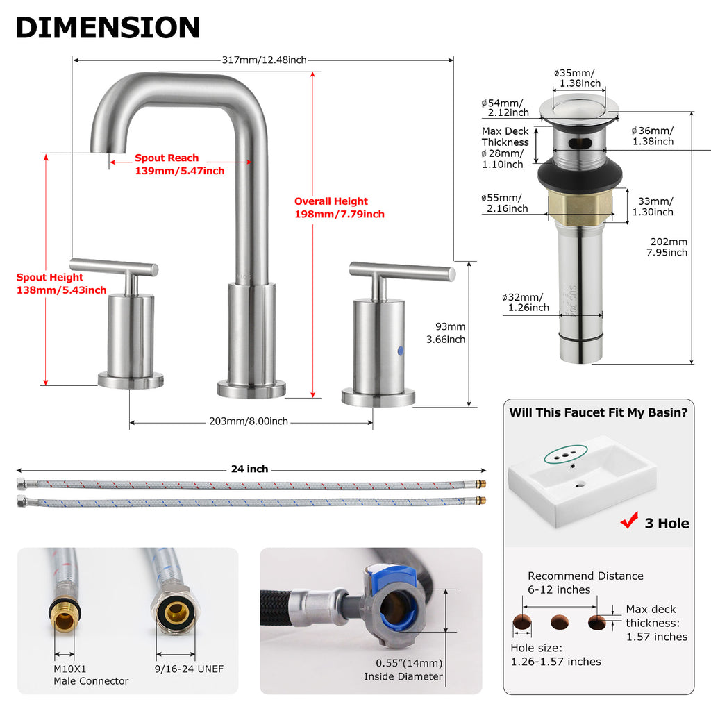 - 3 Holes deck mount compatible with widespread installations at any distance between 6 and 12 inches. Hole size: 32-35mm/ 1.25-1.37 inch.