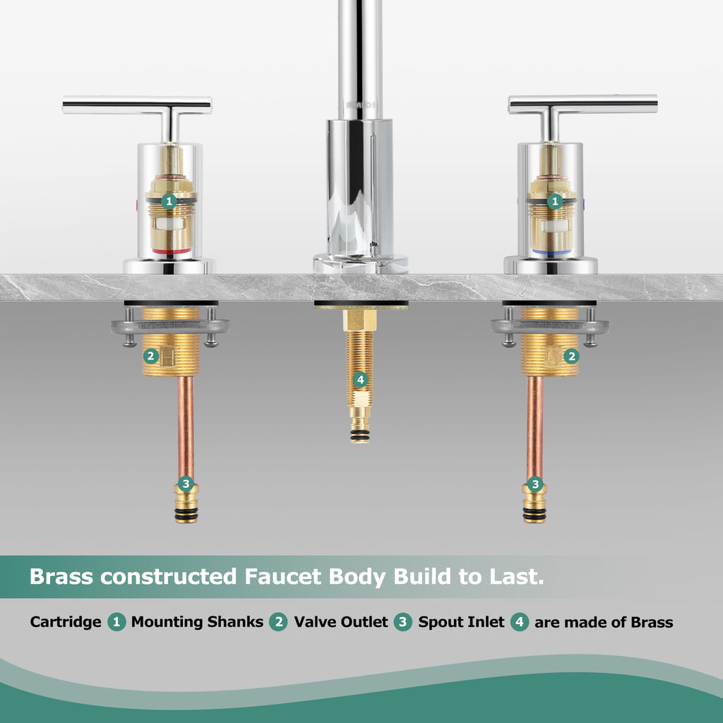 - Brass Constructed Faucet Main Body Build to Last. The Faucet Cartridge, Mounting Shanks, Valve Outlet and Spout Inlet are made of Brass
