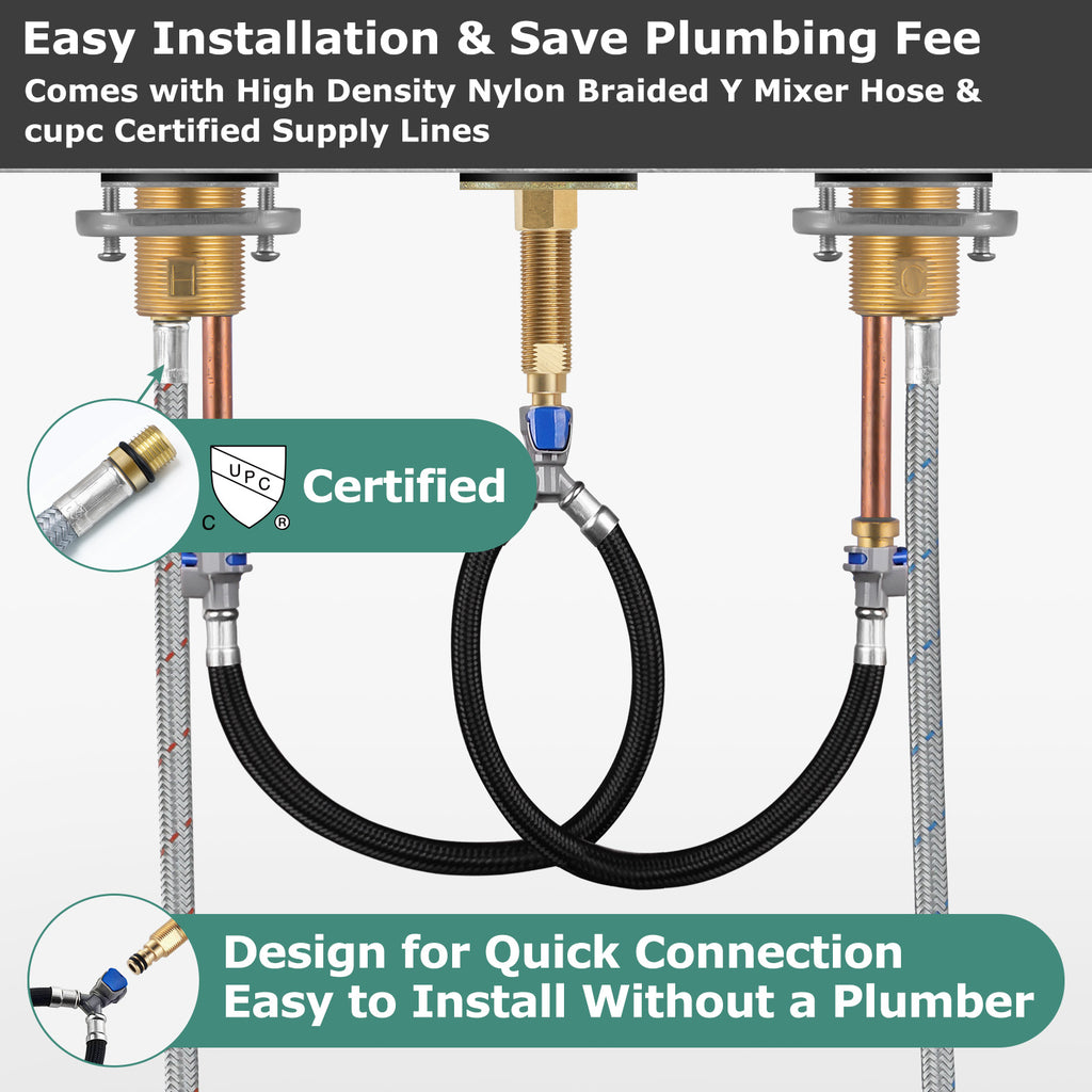 Design to Easy Installation for Saving Plumbing Installation Fee - This 3-Piece bathroom sink faucet with rough-in valve, no more valve required to complete installation. Just join three separated pieces of faucet with "Y" shaped quick connect mixer hose and cUPC certified water supply lines.