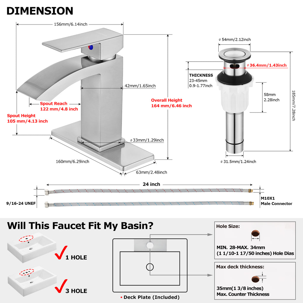 - Comes with Hot & Cold Supply Lines for stop valves connecting. (Length: 23.6 inch /600mm, Thread: 9/16-24 UNEF standard).