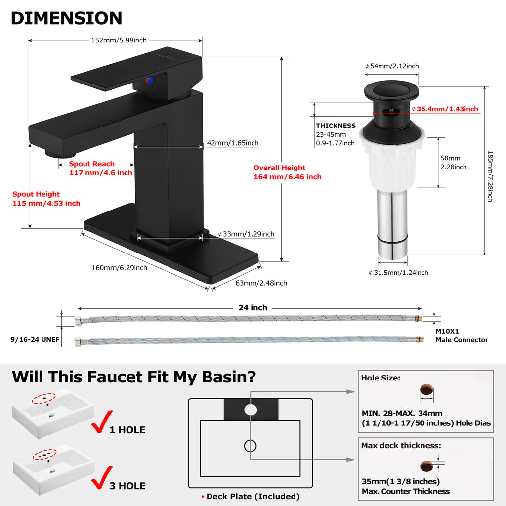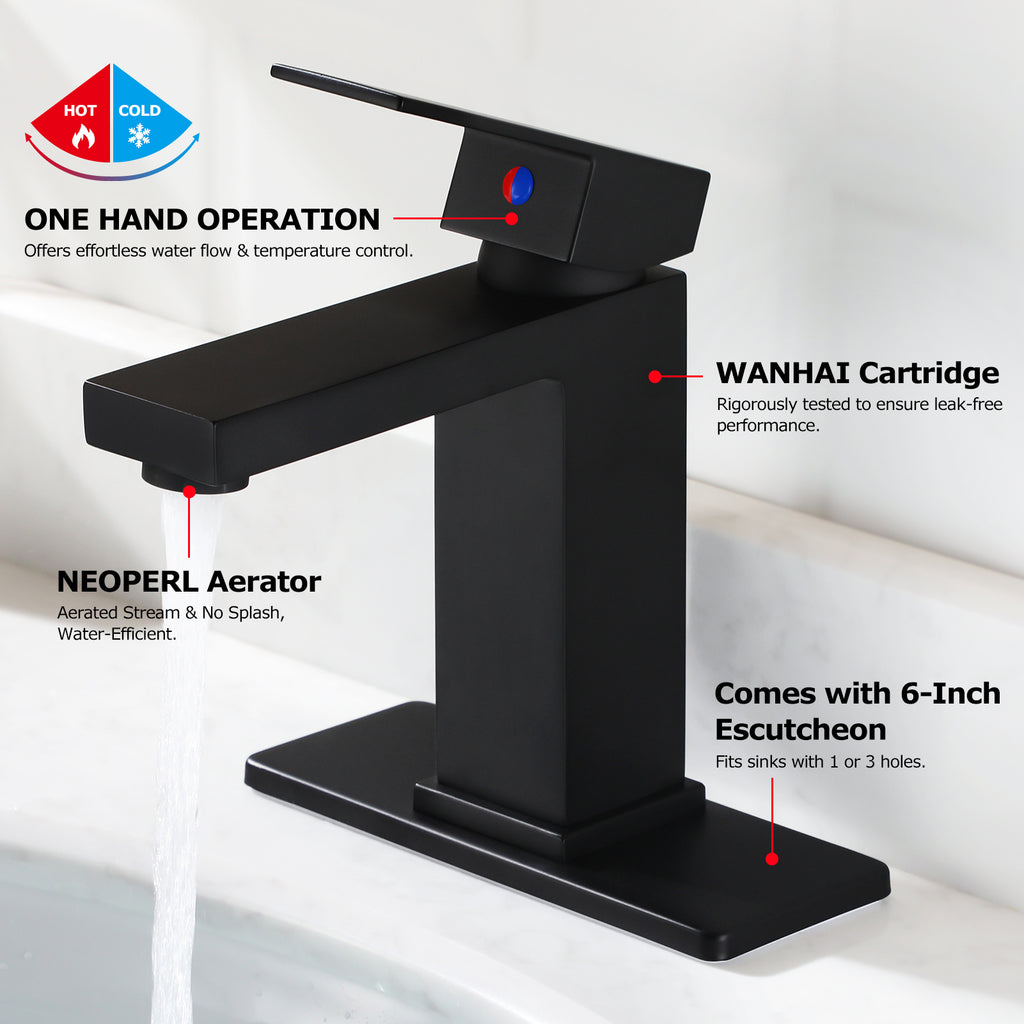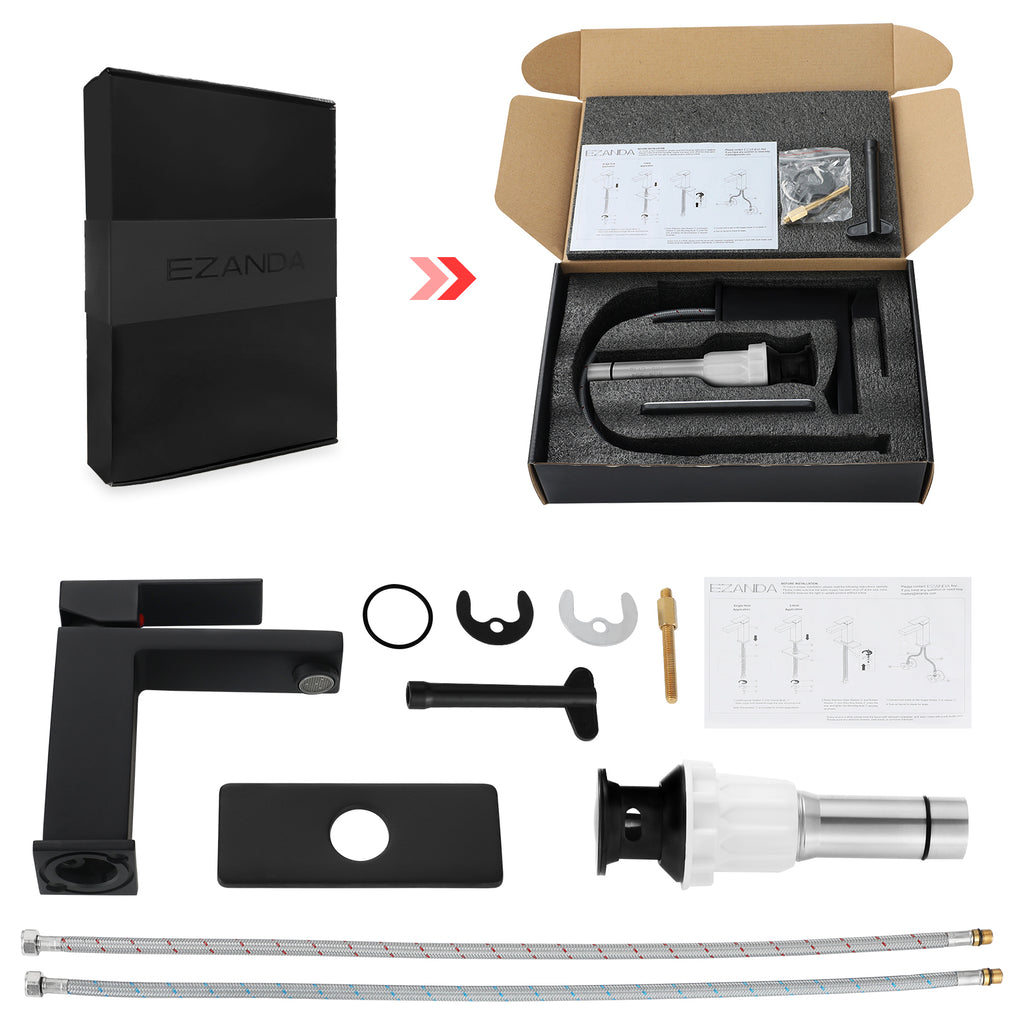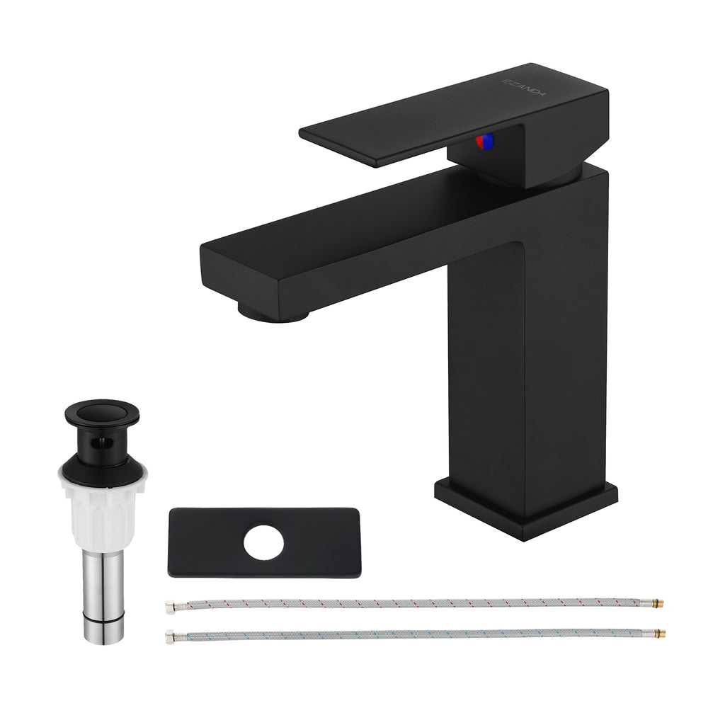 EZANDA Brass Single-Handle Bathroom Sink Faucet with Escutcheon, Pop Up Drain Stopper & Water Supply Hoses, Matte Black (14253)